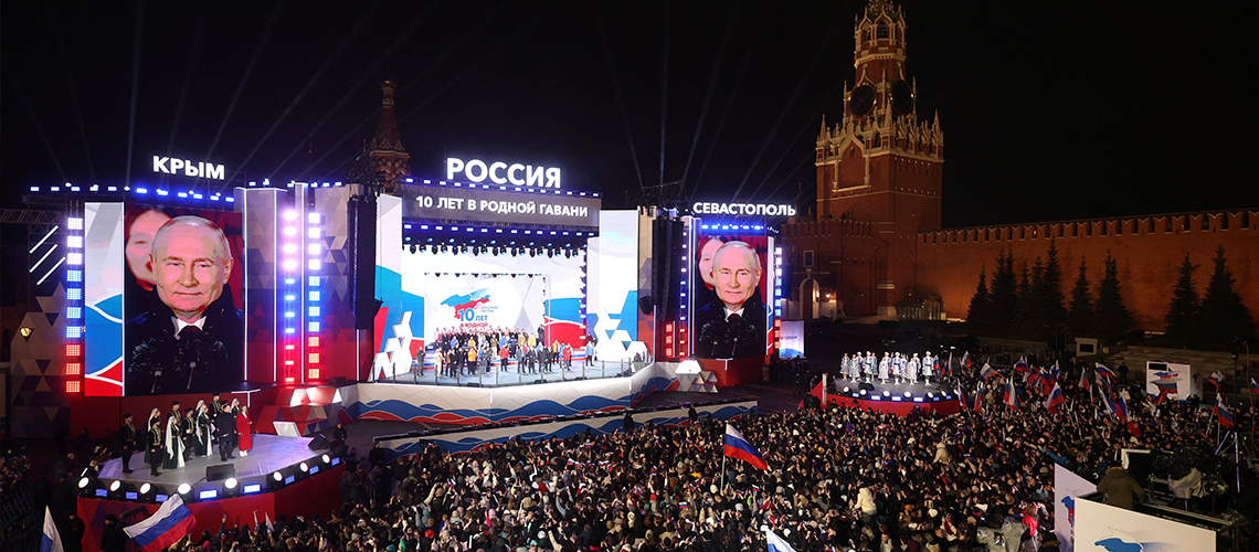 Russian President Vladimir Putin, seen on screens on the stage as he attends a rally, which marks the 10th anniversary of Russia's annexation of Crimea from Ukraine, in Red Square in central Moscow, Russia, 18 March 2024. Sputnik/Gavriil Grigorov/Kremlin via REUTERS