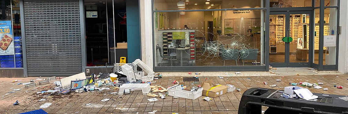Shops destroyed in Hull riots, August 2024. Dom Fellowes/wikimedia commons.